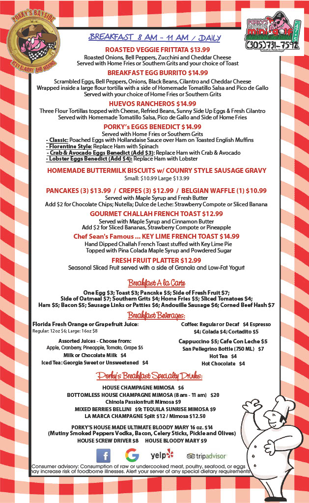 Porky's Bayside Restaurant happy hour menu offering discounted drinks and appetizers